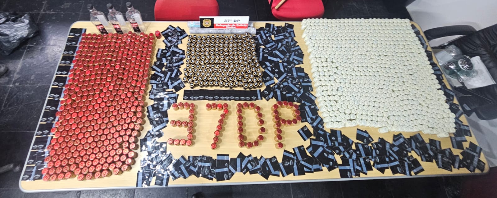 Ao todo, foram apreendidos 1,8 mil lacres e tampas de uísques de diferentes marcas nacionais e importadas, além de três garrafas vazias. Todo o material foi encaminhado para a perícia.