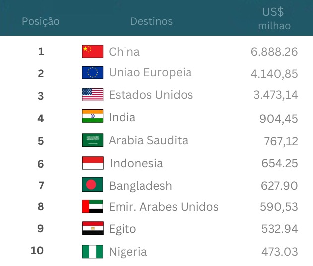 Na balança comercial, o mercado chinês ficou à frente de países da União Europeia (US$ 4,1 bilhões); os Estados Unidos (US$ 3,5 bilhões) e a Índia (US$ 904,4 milhões)