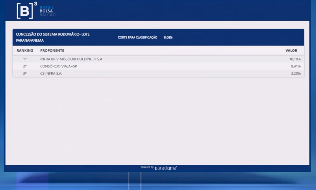 A Infra BR V Missouri Holding III faz proposta de 11,60% e vence o leilão. Ela disputava lances com a Viaja+SP, que não ofertou porcentagem maior.