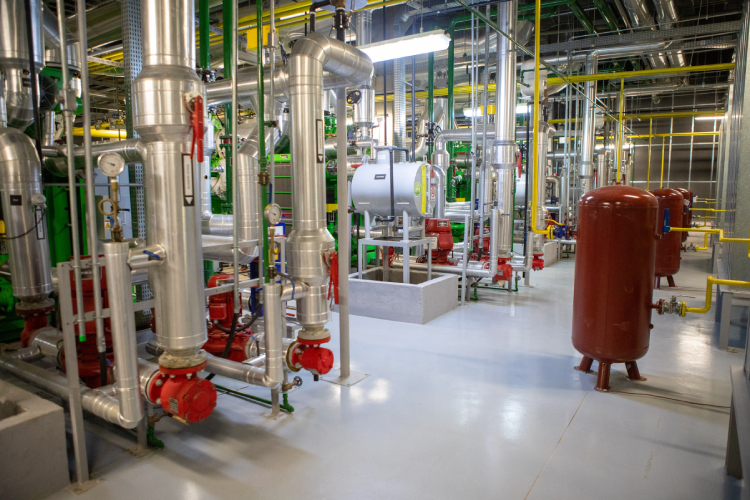 Em outra etapa do processo, a água quente vinda do radiador dos motores será circulada e enviada aos chillers de absorção. Essas máquinas configuram sistemas de refrigeração à base de calor – em vez de usar eletricidade para gerar água gelada, elas operam por meio de um ciclo termodinâmico que envolve um refrigerante e um absorvente.