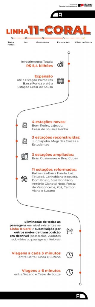 A Linha 11 – Coral terá expansões em seus dois sentidos: no Centro da cidade de São Paulo, será estendida da Estação da Luz até a Estação Palmeiras-Barra Funda e, em Mogi das Cruzes, será prolongada em mais quatro quilômetros, da Estação Estudantes até a Estação César de Sousa.