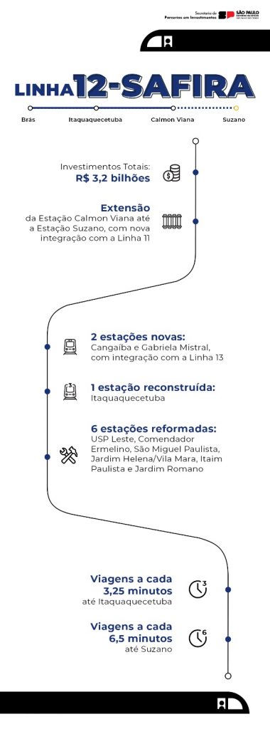 A Linha 12 – Safira terá extensão entre a Estação Calmon Viana e a Estação Suzano, com cerca de 3 km de novos trilhos e nova integração com Linha 11. Também ganhará nova integração com a Linha 13 – Jade nas futuras estações Cangaíba e Gabriela Mistral.