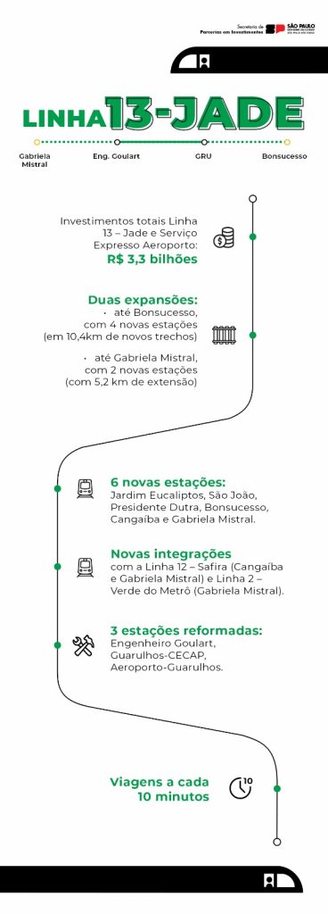 - Investimentos totais Linha 13 – Jade e Serviço Expresso Aeroporto: R$ 3,3 bilhões
