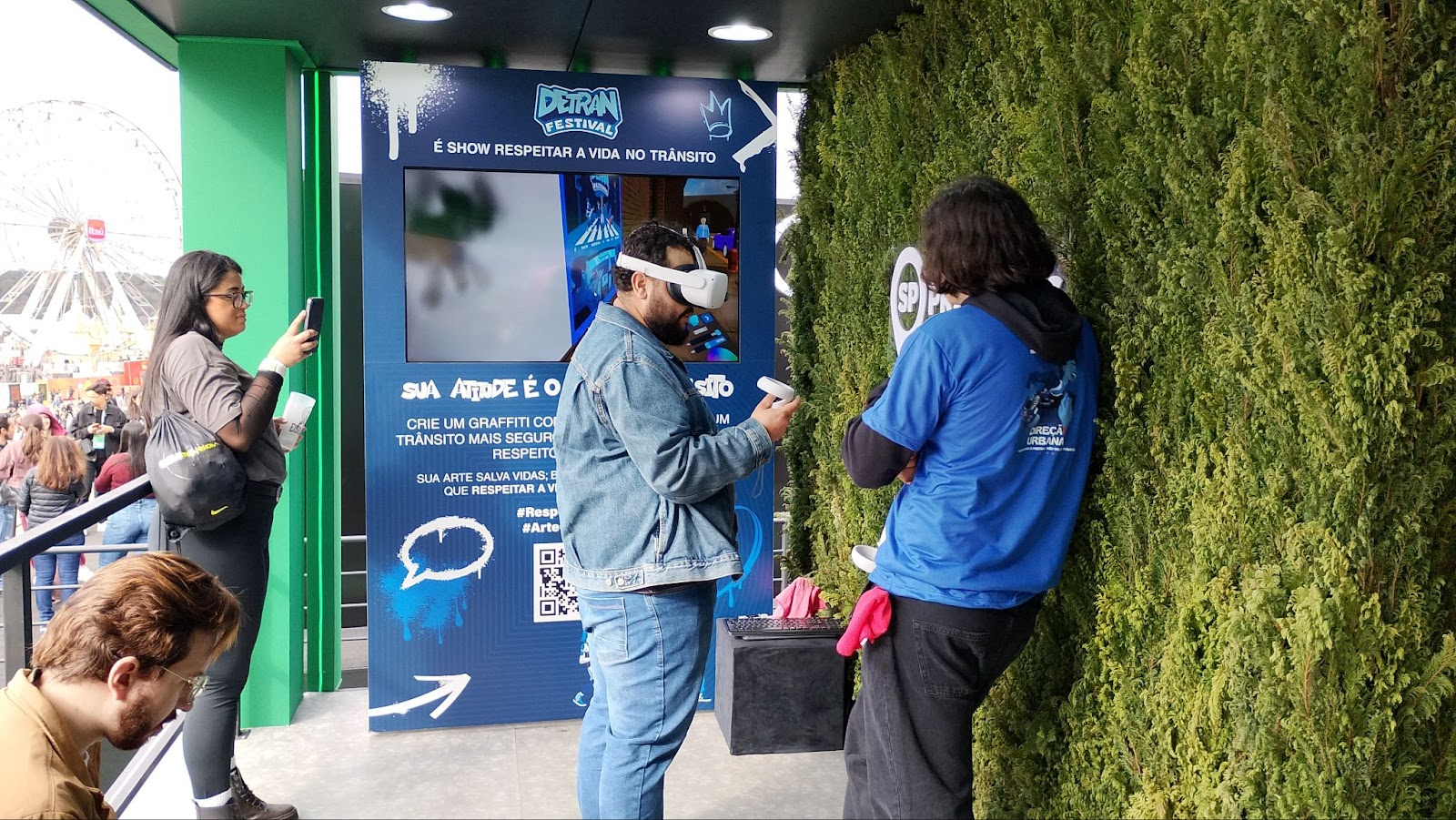 Dentro do estande, o público é convidado a colocar os óculos de VR da campanha e ingressar em um ambiente virtual onde é possível ouvir informações sobre segurança no trânsito e registrar, por meio do grafite, mensagens em um painel virtual