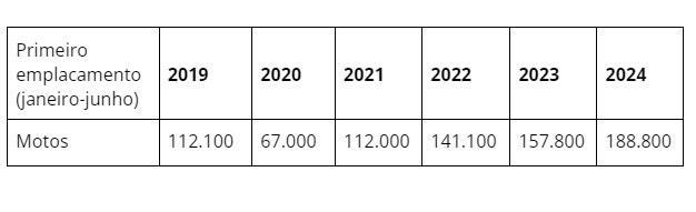 No comparativo direto entre 2019 e 2024, a expansão no volume de primeiras placas para motocicletas surpreende: 68,5%.