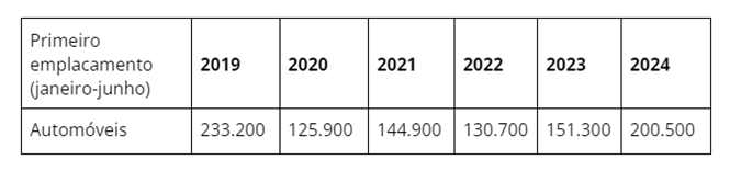 Na tabela abaixo, num recorte dos últimos cinco anos, é possível ver como o volume de primeiras placas de automóveis contabilizado de janeiro a junho de 2024 é o que mais se aproxima do nível pré-pandemia. Mais do que isso, ele representa uma expansão de 32,5% sobre o mesmo período do ano passado. A persistir essa tendência, o patamar pré-pandemia pode ser batido em breve.