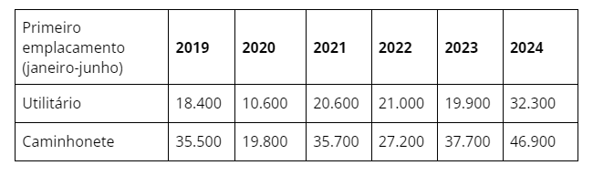 Destaque ainda, neste ano, para o desempenho de utilitários e caminhonetes. Ambos tiveram, de janeiro a junho, o maior número de primeiros emplacamentos dos últimos cinco anos. Na comparação com 2023, o volume de primeiras placas de caminhonete subiu 24,5%. Já os utilitários, veículos que podem ser usados tanto para o transporte de carga como de pessoas, para fins comerciais e pessoais, registraram um salto de 62%.