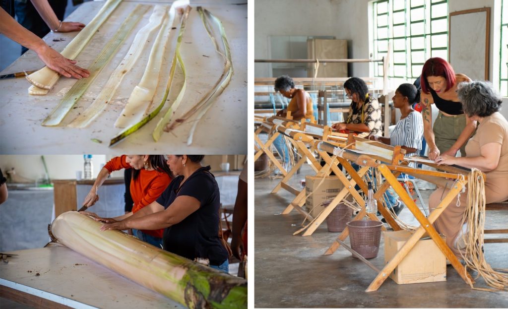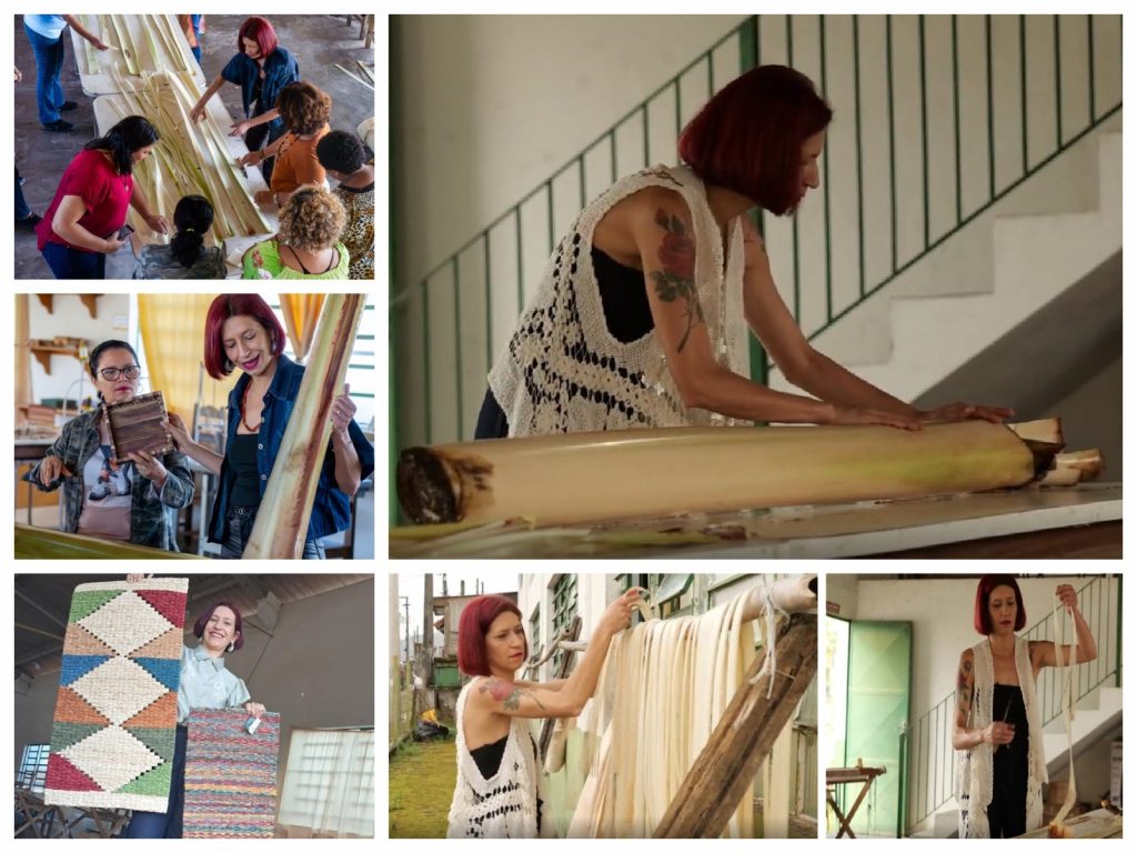 A “transmissão de saberes” dentro da associação abrange desde a identificação das fibras presentes em cada parte da bananeira até o domínio das técnicas de trançado e tecelagem nos teares. Esse aprendizado coletivo se mantém pelo trabalho entre as artesãs da cidade e as mulheres da zona rural, todas capacitadas para atuar nas diferentes etapas do processo, da extração e preparo das fibras à confecção das peças.
