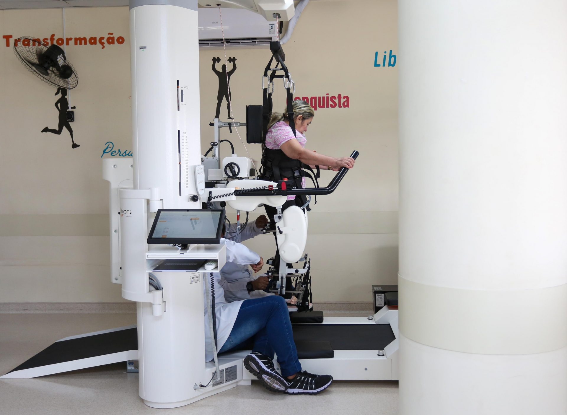 Já sobre a esteira rolante, e com auxílio de um fisioterapeuta, o usuário é estimulado a se locomover em um treinamento intensivo para aumento de força dos músculos e amplitude de movimentos, inclusive com uso de gameterapia — o que desafia o paciente e traz aumento de performance.