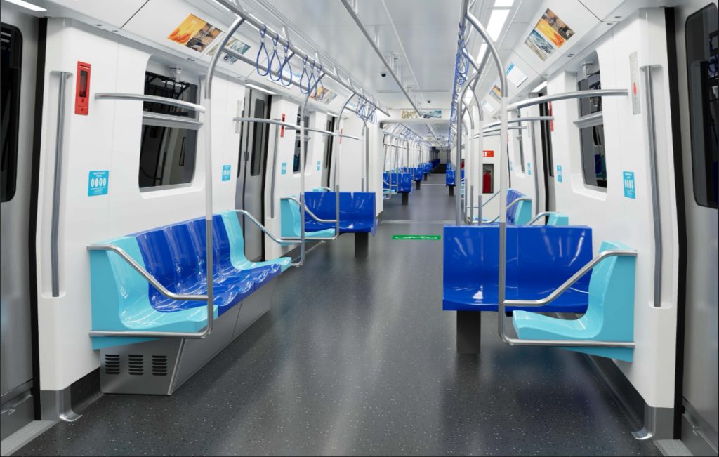 Já o interior do trem terá paredes laterais e teto na cor branca e piso com revestimento cinza escuro. Os assentos preferenciais são da cor azul clara e os demais serão azul em tom mais forte. Barras e alças estarão distribuídas ao longo do salão, que terá iluminação homogênea em LED, com painéis eletrônicos de informação completando um ambiente interno moderno, pensado para a boa experiência do passageiro.