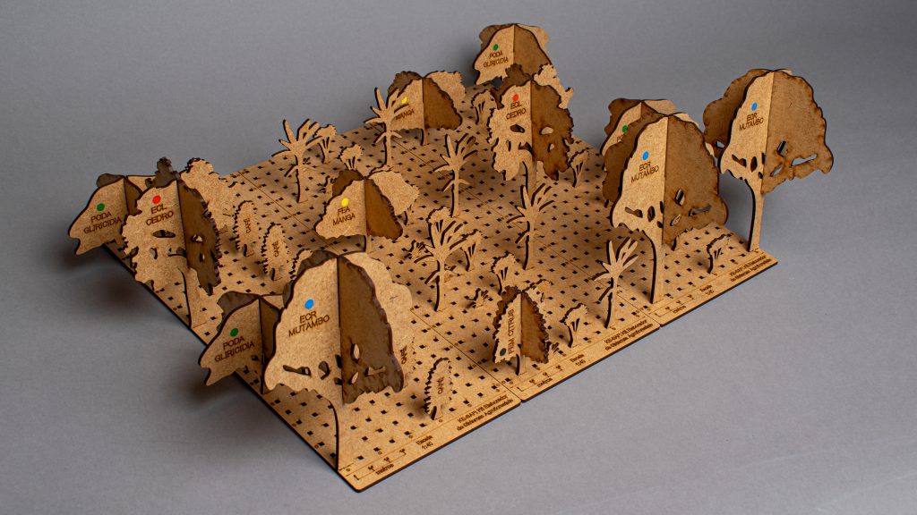 Produzido em MDF cortado a laser, o kit contém 300 peças que representam diversas culturas agrícolas e espécies arbóreas, organizadas por estratos ecológicos