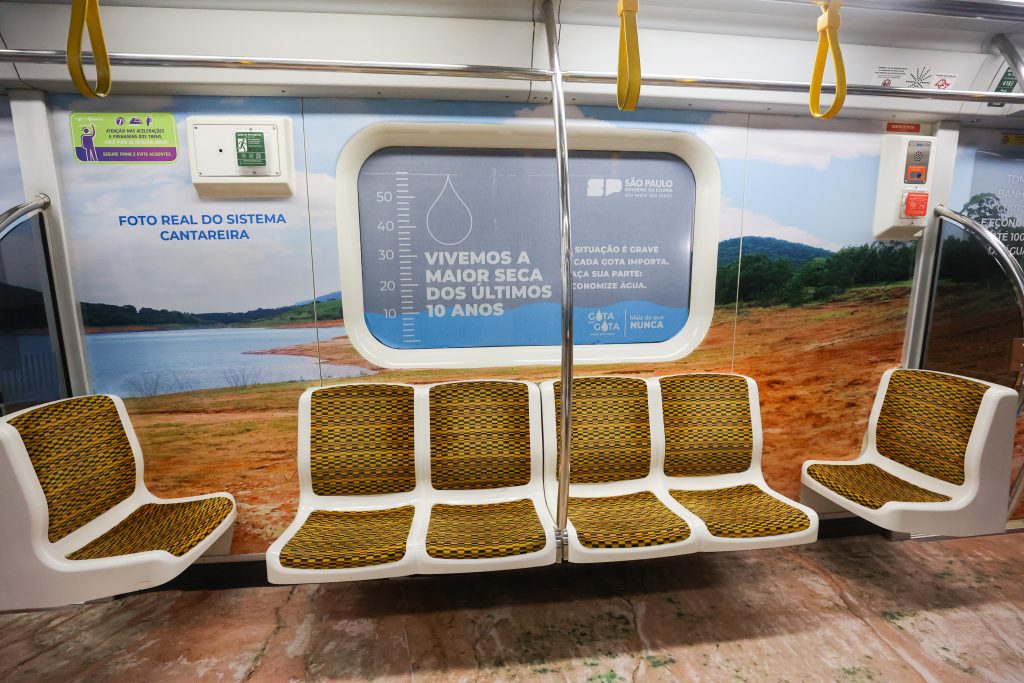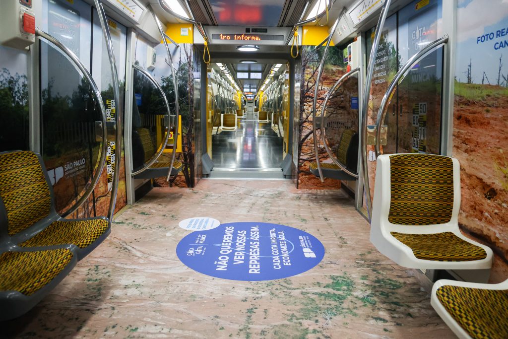 As composições da Linha 4-Amarela de metrô ganharam um visual personalizado com uma ação imersiva da campanha do Governo de São Paulo para urgência na economia do uso da água. A partir da desta segunda-feira (16), o trem está envelopado com adesivos para conscientizar milhares de passageiros que usam o sistema todos os dias sobre a gravidade da situação e a necessidade de reduzir o consumo. A iniciativa faz parte da campanha “Gota por gota. Mais do que Nunca”, lançada neste mês.