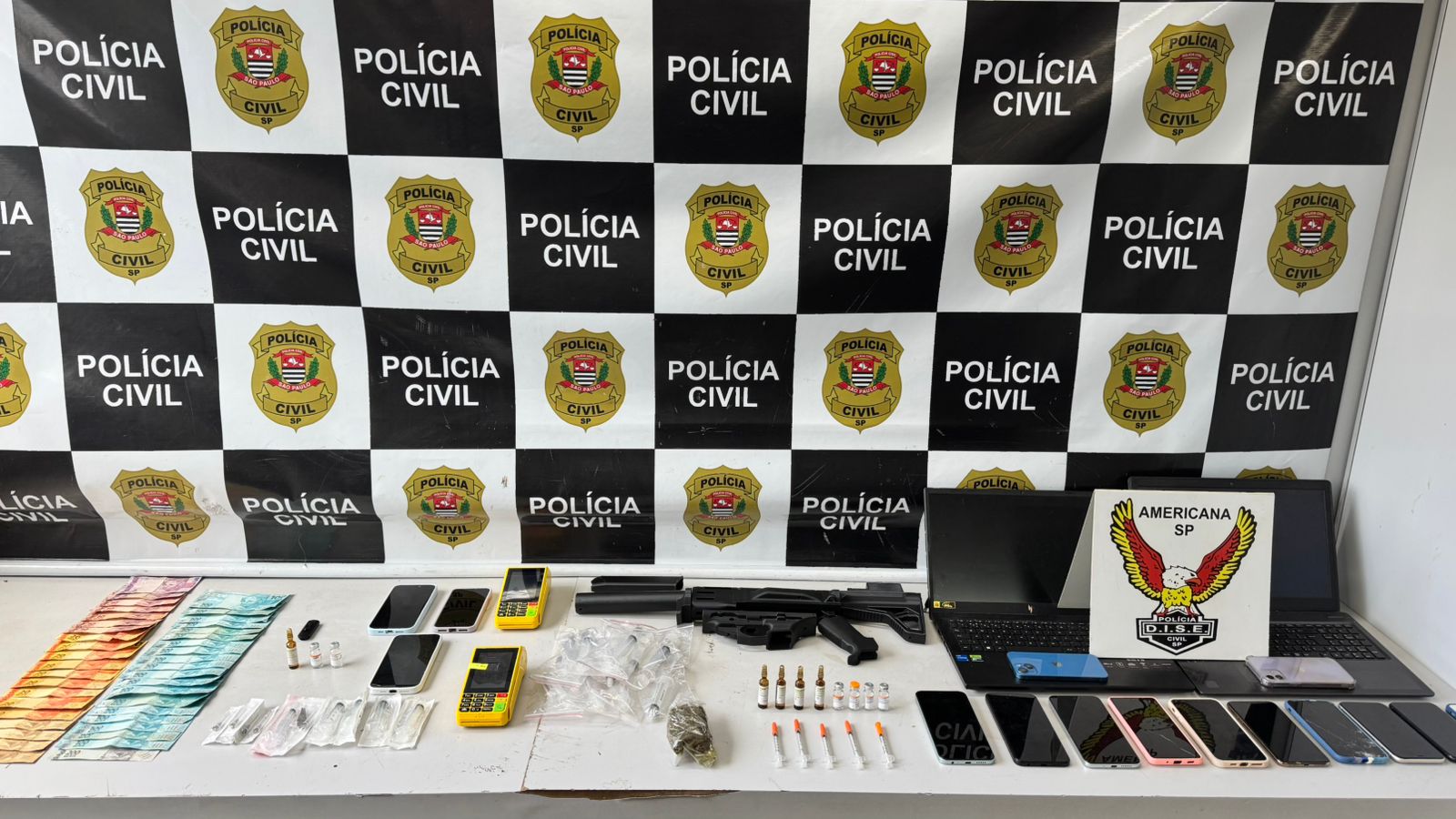 Também foram apreendidos R$ 2,5 mil em espécie, 15 aparelhos celulares, dois notebooks, um pendrive e duas máquinas de cartão e a réplica do fuzil.