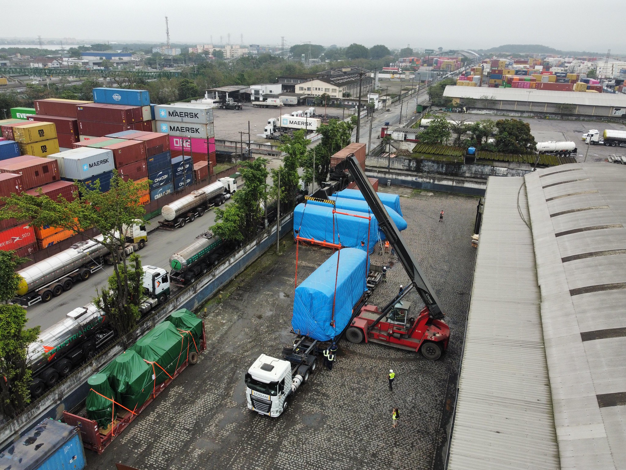 Assim que a carga recebeu a liberação portuária para ser retirada, teve início o processo de logística do traslado de Santos até o Pátio Água Espraiada.