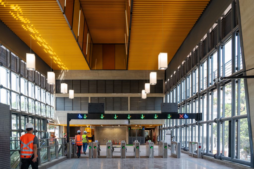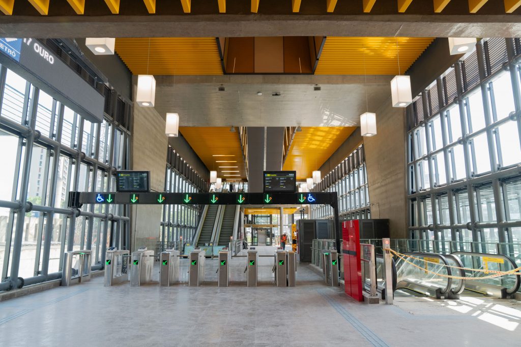 A estação já tem estruturadas suas áreas principais, como plataforma, mezaninos, acessos e circulações. A fase atual concentra os acabamentos finais, a integração dos sistemas operacionais e os testes dinâmicos que antecedem a operação assistida da Linha 17-Ouro, prevista para iniciar ainda neste mês.