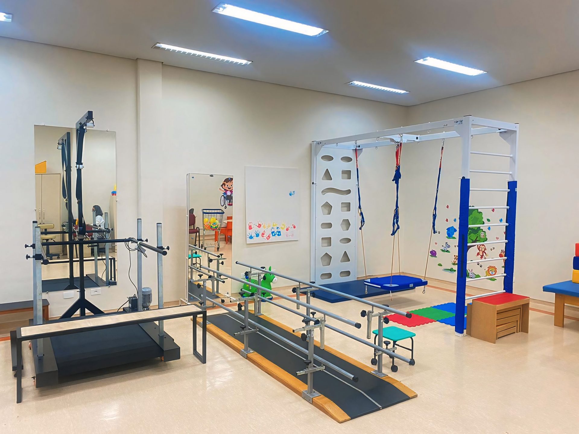 O local está equipado com uma esteira moderna para o treino de marcha, onde a locomoção pode ser trabalhada de modo personalizado, ajudando as crianças a desenvolver mais equilíbrio e coordenação motora de forma mais eficiente e segura.