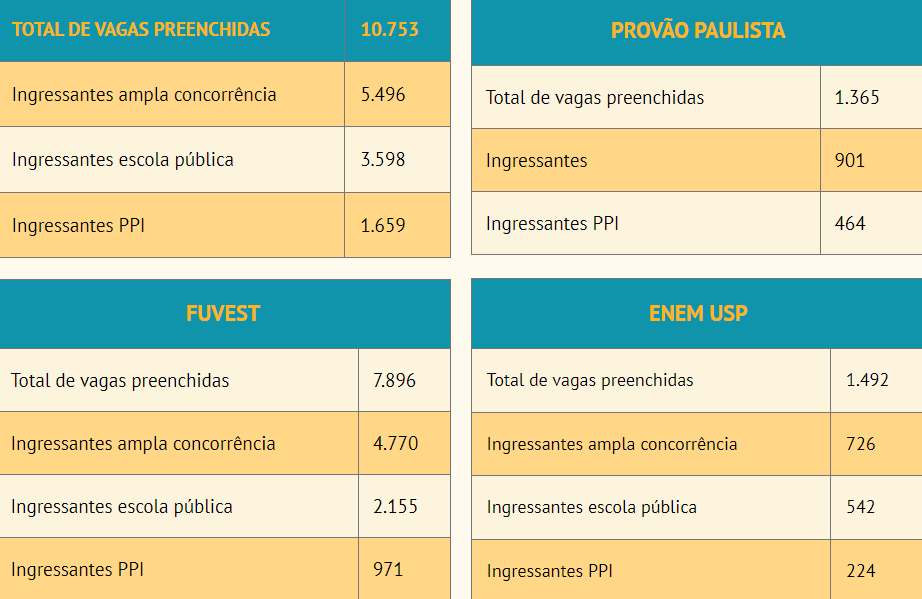 Esses dados se referem às três formas de ingresso adotadas pela USP neste ano: a Fuvest, o Enem USP e o Provão Paulista, exame promovido pela Secretaria da Educação do Estado de São Paulo para garantir o acesso de estudantes de escolas públicas a vagas nas universidades paulistas.