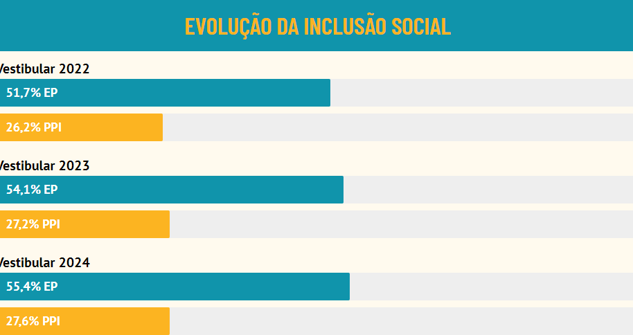 A USP alcançou o índice de mais de 55% de ingressantes vindos de escolas públicas e de pretos, pardos e indígenas (PPI). Em 2024, do total de 10.753 vagas preenchidas, 5.954 (55,4%) são de estudantes que cumpriram o ensino médio exclusivamente em escolas públicas (EP), incluindo 2.965 (27,6%) autodeclarados PPI. No ano passado, esses índices foram de 54,1% e 27,2%, respectivamente.