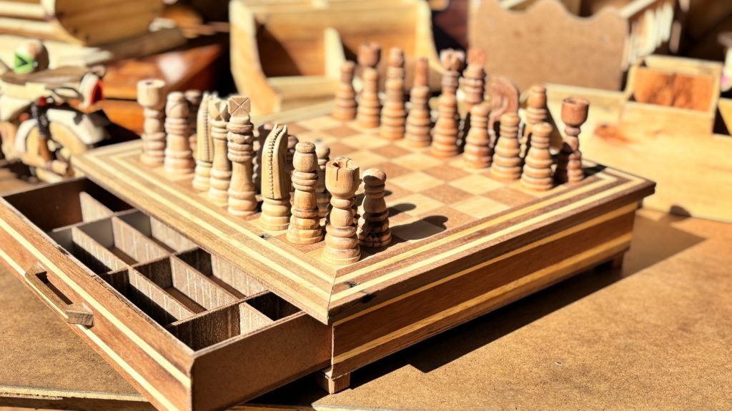 Na oficina são produzidos diversos itens, entre eles cachepôs, vasos, porta-joias, brinquedos de madeiras, pergolados, estufas, tabuleiros e peças de xadrez, painéis e moinhos.