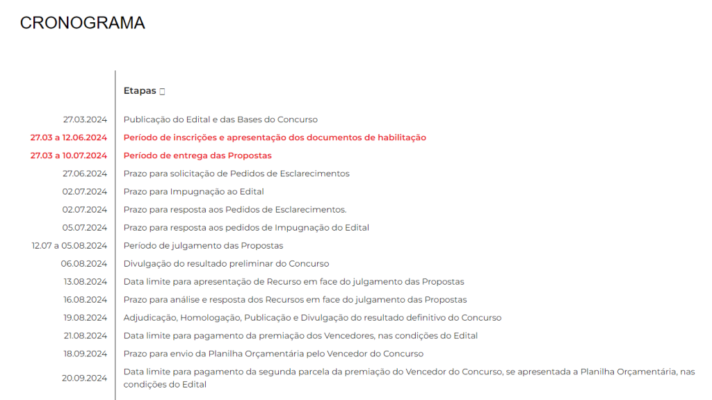 Já o período para os concorrentes entregarem as propostas contendo os estudos preliminares foi prorrogado e termina no dia 10 de julho. O julgamento das propostas recebidas vai até 5 de agosto, e a data limite para homologação e divulgação do resultado definitivo do concurso é em 19 de agosto.