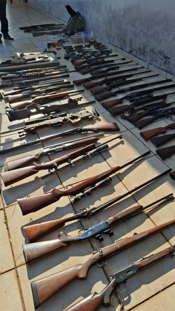 No endereço, as equipes realizaram uma vistoria no imóvel principal, onde foram encontradas 21 pistolas, 12 revólveres, quatro garruchas, uma submetralhadora, quatro armas de fogo não identificadas e 66 armas longas, incluindo espingardas e três armas de pressão.