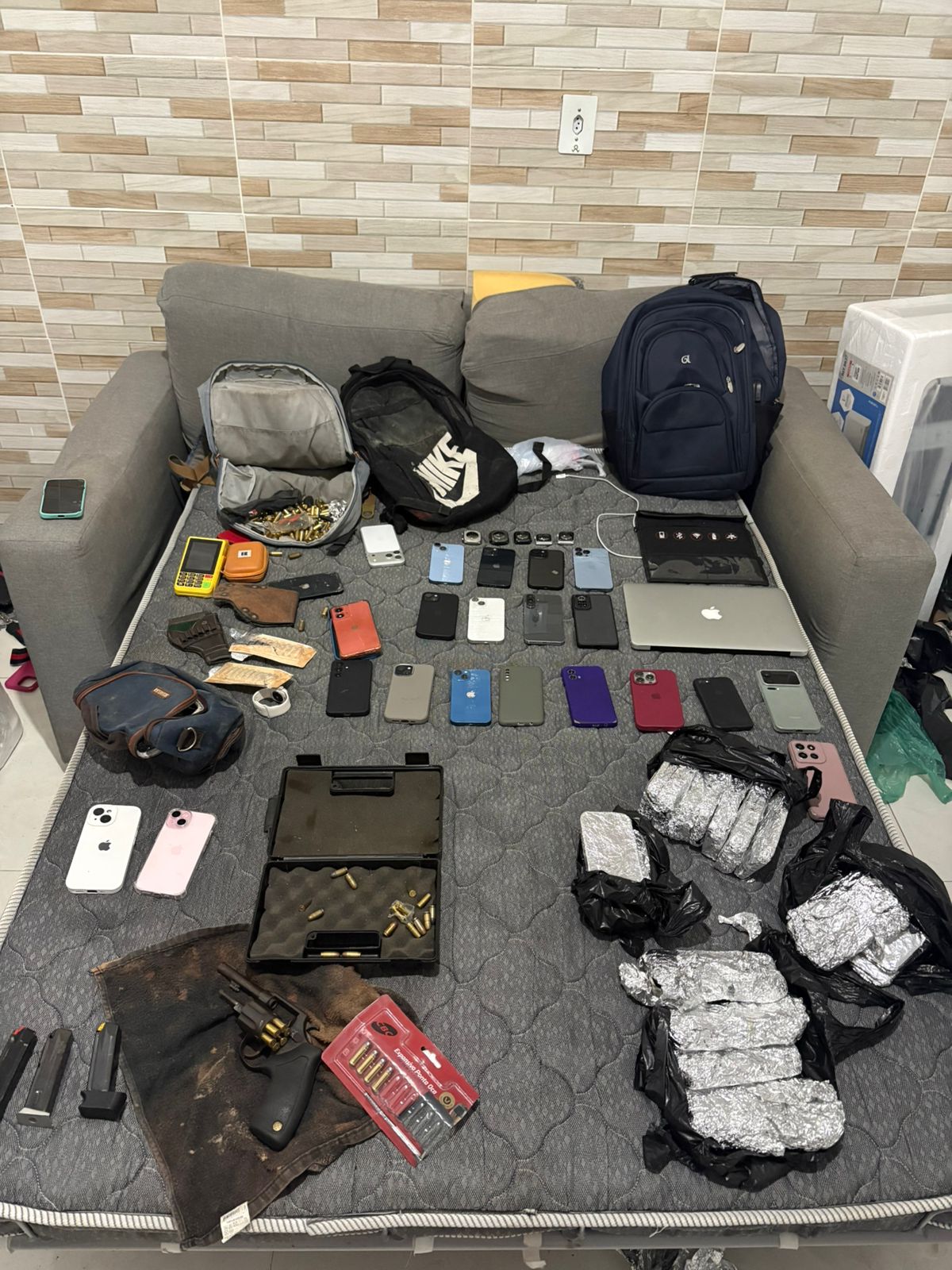 No total, foram recolhidos 96 celulares de diversos modelos, 11 notebooks, oito relógios de pulso, duas máquinas de cartão, quatro carregadores de munição, um revólver e cerca de 200 munições. Ninguém foi encontrado no local. A suspeita é que os itens tenham sido roubados ou furtados.