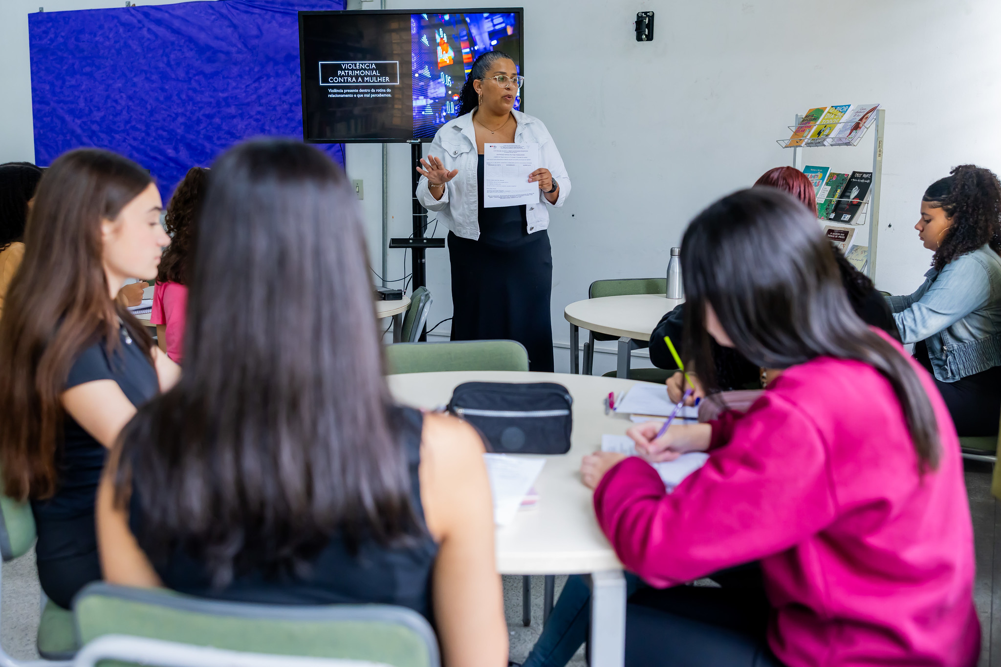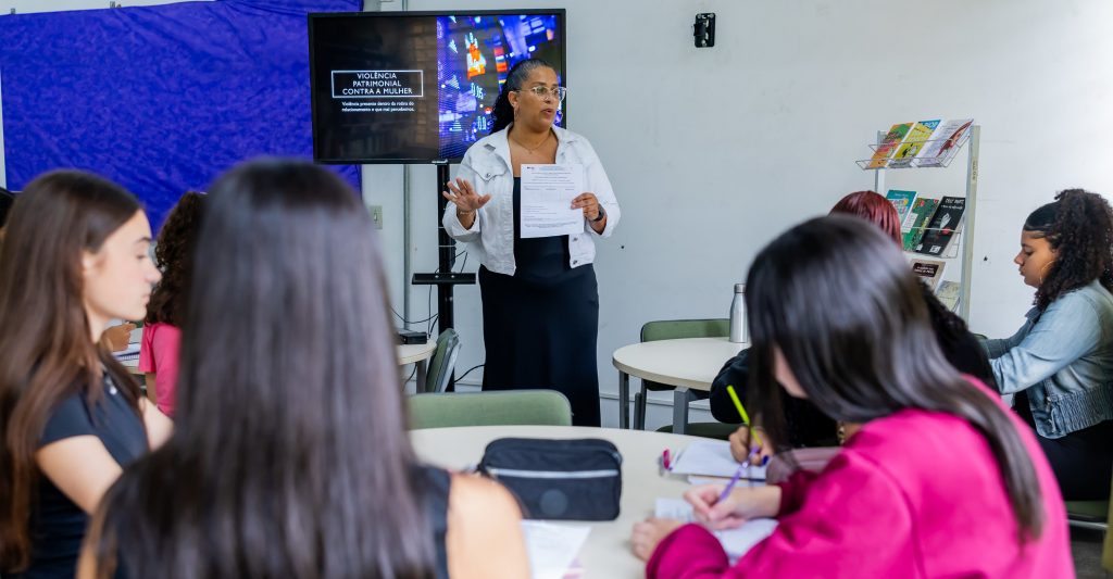 Nas escolas de ensino integral da Secretaria da Educação do Estado de São Paulo (Seduc-SP), além das disciplinas comuns do Currículo Paulista, professores e estudantes são incentivados a criar novas turmas a cada semestre. São as chamadas disciplinas eletivas, que devem apoiar o projeto de vida dos alunos. Na Escola Estadual Diplomata Sérgio Vieira de Mello, a professora de educação financeira e matemática Daniela Aparecida Gomes dos Santos criou, neste ano, a disciplina “Protagonismo feminino na educação financeira e empreendedorismo”. O objetivo é apresentar ferramentas para que as alunas tenham consciência e possam se proteger dos riscos da violência financeira e patrimonial, uma das manifestações da violência contra a mulher amparadas pela Lei Maria da Penha. O conteúdo proposto pela professora Daniela dialoga com as aulas de educação financeira do Currículo Paulista, disciplina fixa implantada em 2024 pela gestão.