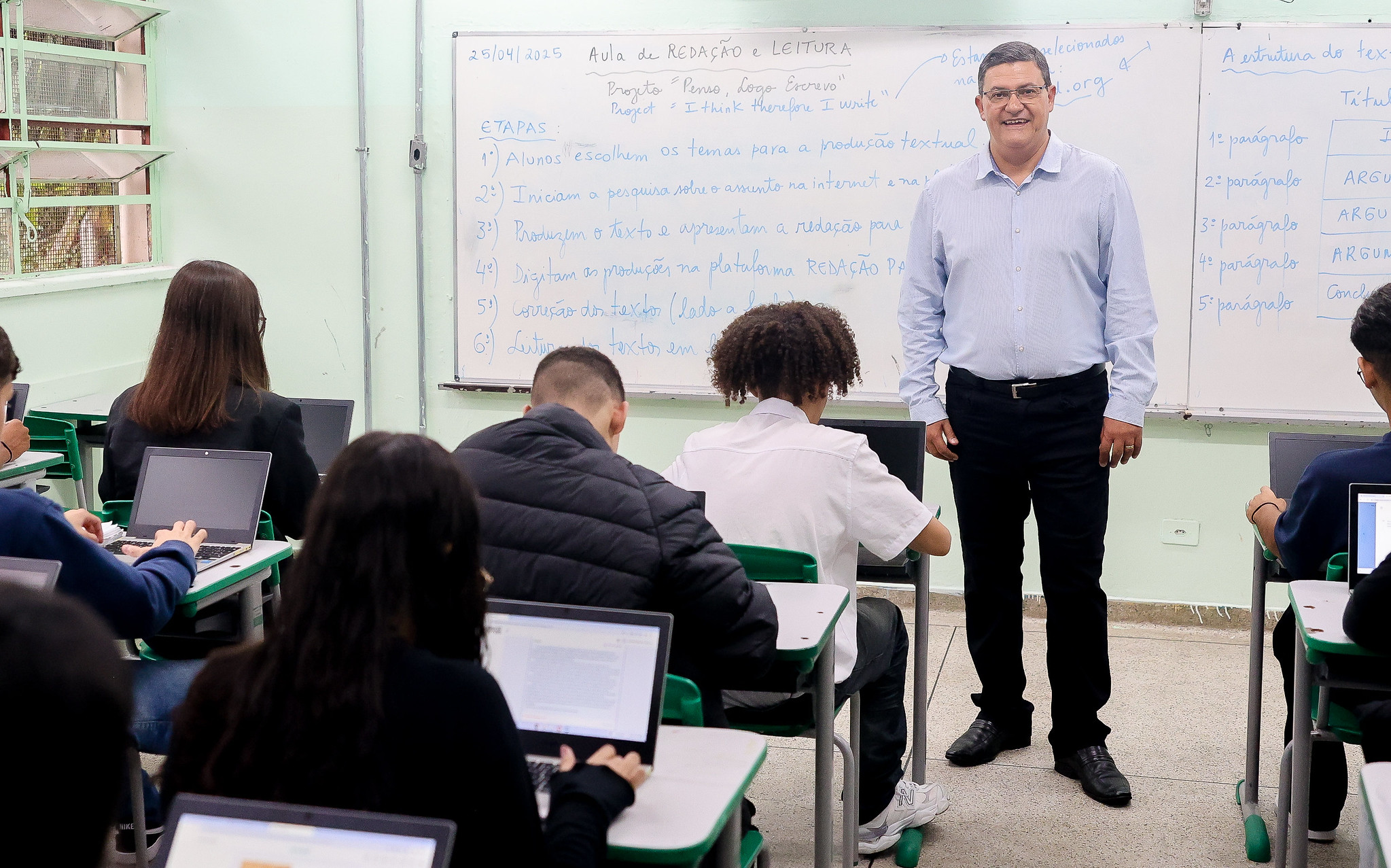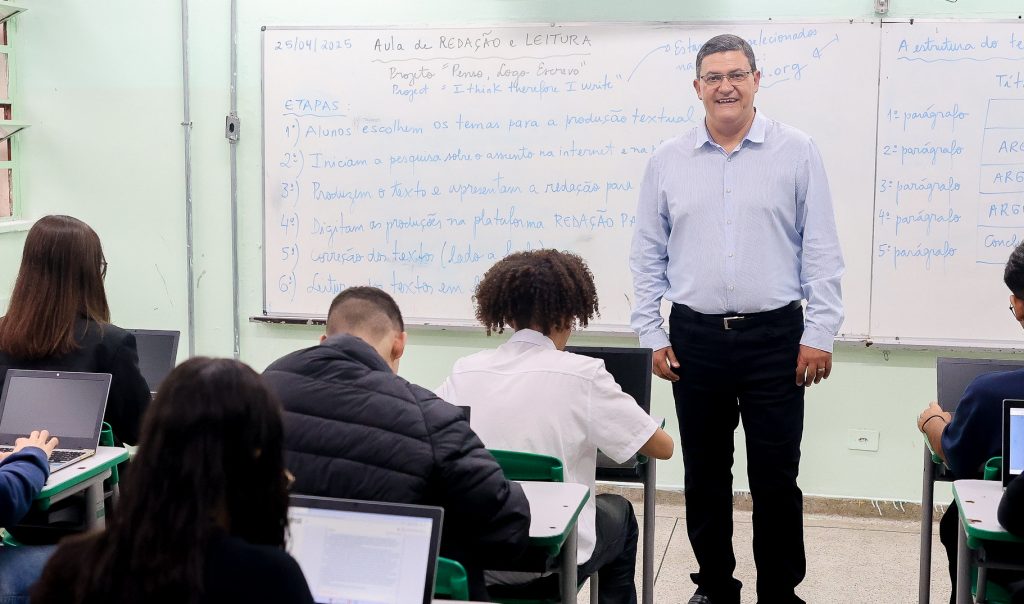 A disciplina de redação e leitura foi implantada pela Secretaria da Educação do Estado de São Paulo (Seduc-SP) em 2024 e integra as ações da pasta para ampliar o número de aulas destinadas ao aprendizado de língua portuguesa. O professor Wagner destaca a iniciativa da pasta: “A grande vantagem é que essa disciplina foca e centraliza em tarefas essenciais que são a redação e leitura, que são parte integrante do ‘Penso, Logo Escrevo’”. Foi nesta gestão que o professor também ganhou outra aliada, a plataforma Redação Paulista, mais uma ferramenta da Educação de SP de incentivo à produção textual. Apenas em 2024, os 397 estudantes do Ensino Médio da EE Fadlo Haidar produziram 2.168 redações apenas na plataforma, uma média de 5,4 textos por aluno.
