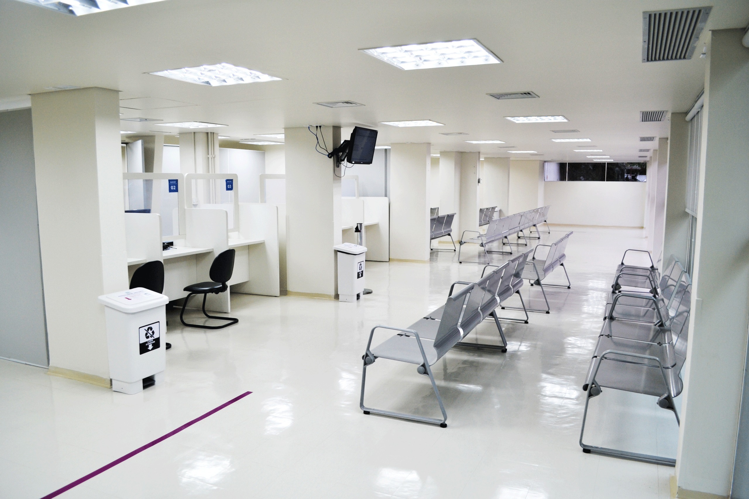 Além da climatização, a reforma inclui reestruturação hidráulica, elétrica e de marcenaria, garantindo mais conforto e segurança. No piso, faixas coloridas orientam o fluxo de pacientes, indicando de forma clara a direção para consultórios, área de medicação e salas de exames. O espaço também foi equipado com painéis de acessibilidade que emitem avisos sonoros com o nome e a senha do paciente, ampliando a inclusão no atendimento.