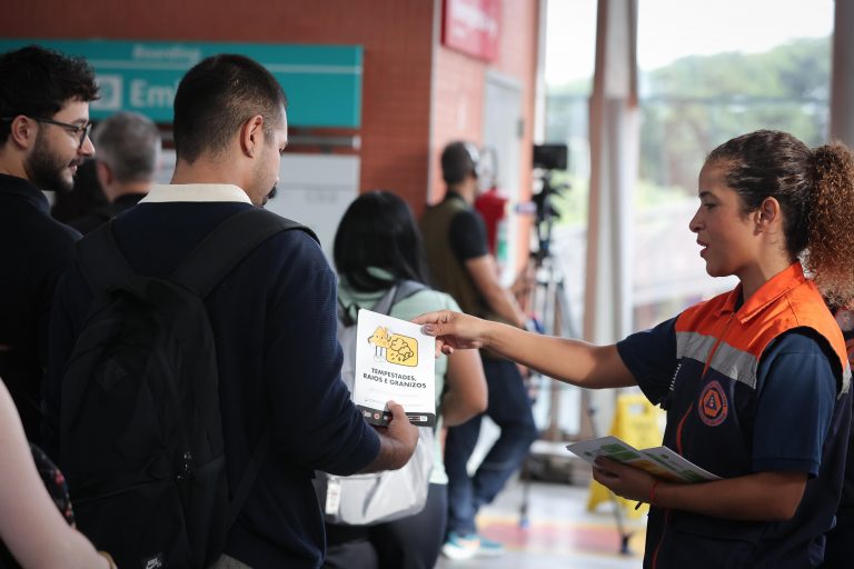 Agentes estão na interligação entre a Linha 4 – Amarela e Linha 9-Esmeralda para distribuir folhetos com orientações sobre o que fazer para se prevenir dos alagamentos, quedas de árvores, granizo e raio