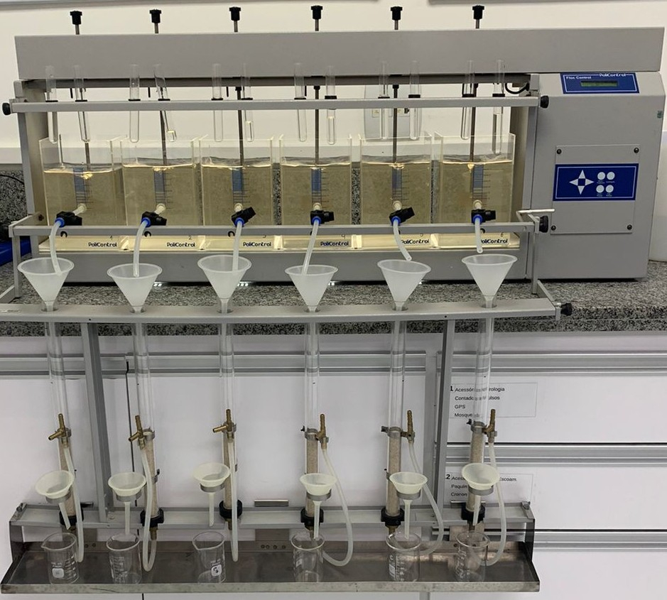 A água contaminada por microplásticos passou pelo processo de coagulação e filtração no chamado Jar Test, equipamento que reproduz em pequena escala os processos de tratamento de água. Os resultados foram comparados aos dos mesmos testes realizados em água com sulfato de alumínio, composto usado nos tratamentos tradicionais.