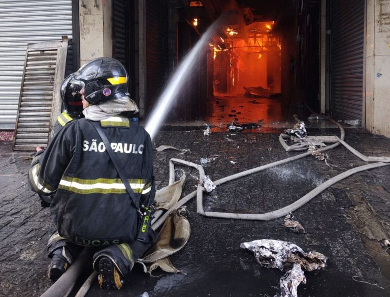 Corpo de Bombeiros do Estado de São Paulo trabalha para conter um incêndio no Brás, região central da Capital