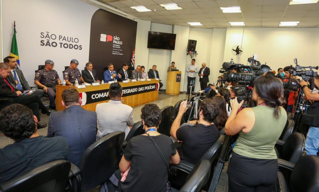 Autoridades de forças policiais reunidos para coletiva de imprensa sobre o caso. Foto: Governo de São Paulo/Divulgação